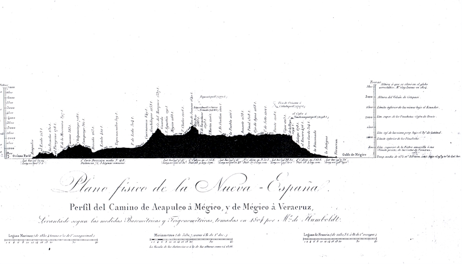 Made up of 19 plates, the Atlas géographique et physique du royaume de la Nouvelle Espagne accompanies the Essai and was published simultaneously in 7 fascicles from 1808 to 1811.(25) The historian of geography and Humboldt scholar Hanno Beck has often emphasized that Humboldt, probably influenced by his work as a miner, made the profile map, originally a view into the mine from the side, into a scientific instrument. Part of this is the marvelous profile of the Mexican highland (see fig. 6) - "the first profile ever to be done of an entire country".(26)